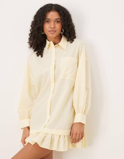 ASOS DESIGN – Jasnożółta sukienka koszulowa mini z długimi rękawami i falbanką na dole