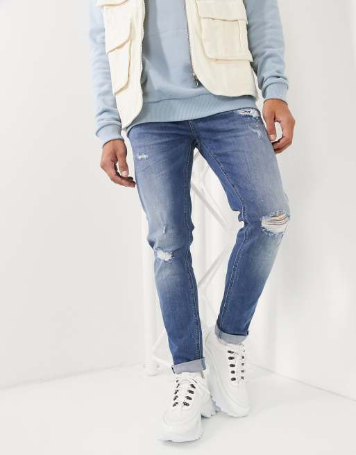 ASOS DESIGN – Jeansy o obcisłym kroju z przedarciami i rozdarciami w spranym niebieskim odcieniu