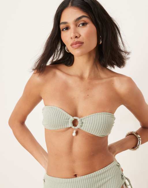ASOS DESIGN – Kai – Szałwiowa fakturowana góra od bikini z dekoltem bandeau i ozdobną perełką