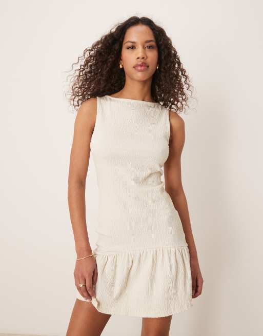 ASOS DESIGN – Kamiennobeżowa gnieciona sukienka mini bez rękawów z prostym dekoltem i baskinką