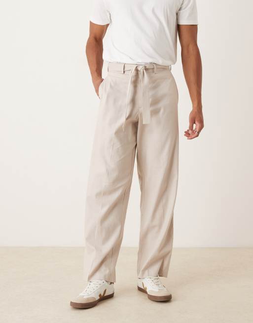 ASOS DESIGN – Kamiennobeżowe eleganckie lniane spodnie z szerokimi nogawkami i paskiem