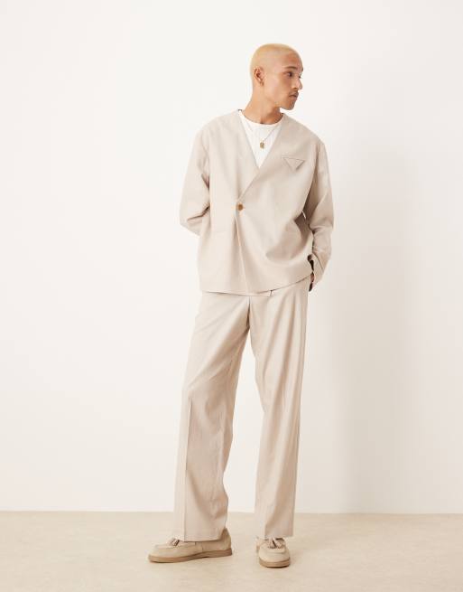 ASOS DESIGN – Kamiennobeżowe szerokie spodnie garniturowe z materiału z dodatkiem lnu
