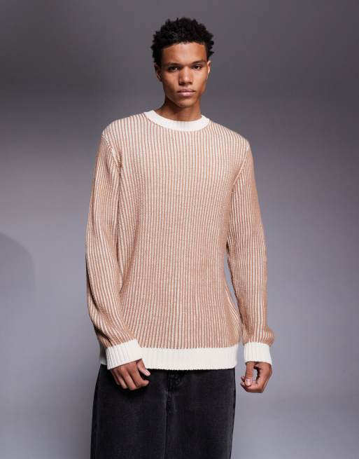 ASOS DESIGN – Kamiennobeżowy prążkowany sweter dzianinowy o luźnym kroju z okrągłym dekoltem