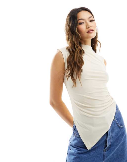 ASOS DESIGN – Kamiennobeżowy top z asymetrycznym szwem, zabudowanym dekoltem i marszczeniem