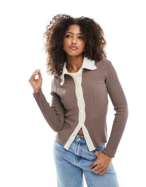 ASOS DESIGN – Kawowy dzianinowy kardigan z kontrastowym szydełkowanym kołnierzykiem