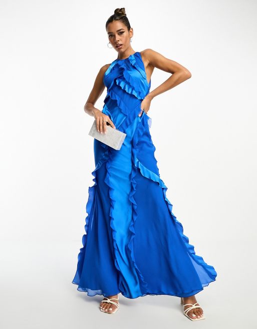 ASOS DESIGN – Kobaltowoniebieska satynowa sukienka maxi z falbanką o kroju bokserki
