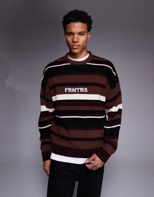 ASOS DESIGN – Kolorowy dzianinowy sweter w paski z nadrukiem na klatce piersiowej