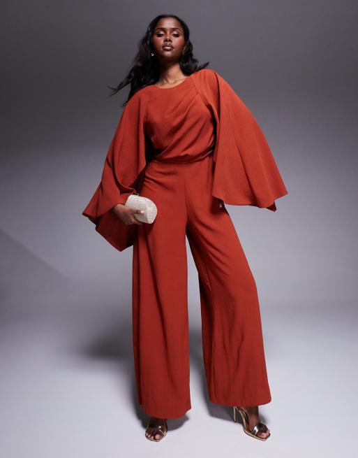 ASOS DESIGN – Kombinezon w ciemnym odcieniu rdzy z szerokimi nogawkami, ozdobną peleryną i odkrytymi plecami