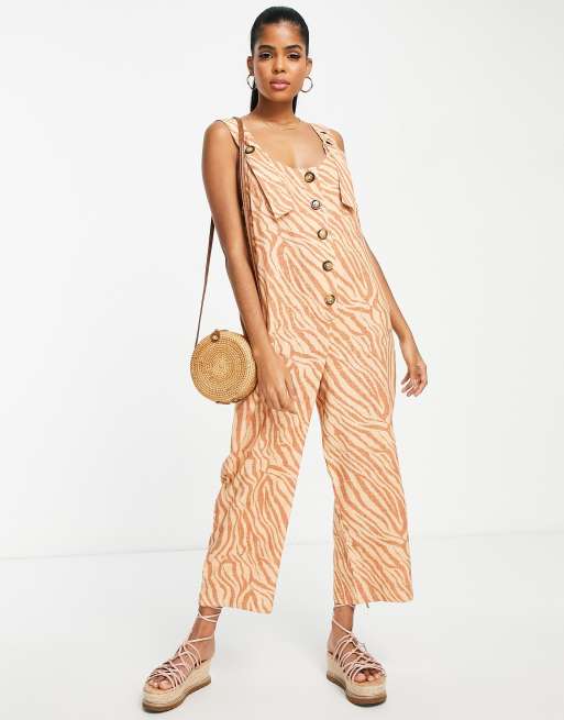 ASOS DESIGN – Kombinezon w zwierzęcy wzór na ramiączkach z guzikami z dodatkiem lnu