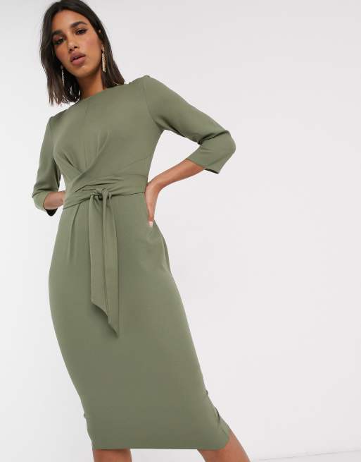 ASOS DESIGN – Kopertowa sukienka midi w kolorze khaki z wiązaniem w talii