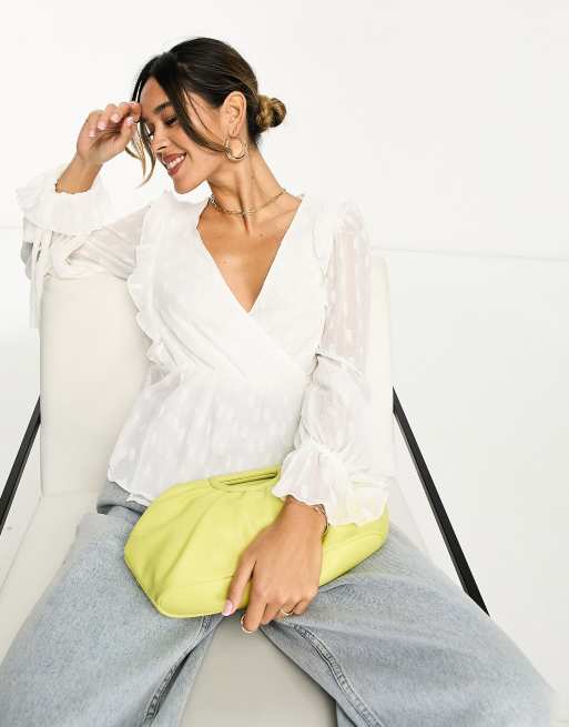 ASOS DESIGN – Kopertowy top z tkaniny dobby w kolorze kości słoniowej z falbanką przy mankietach