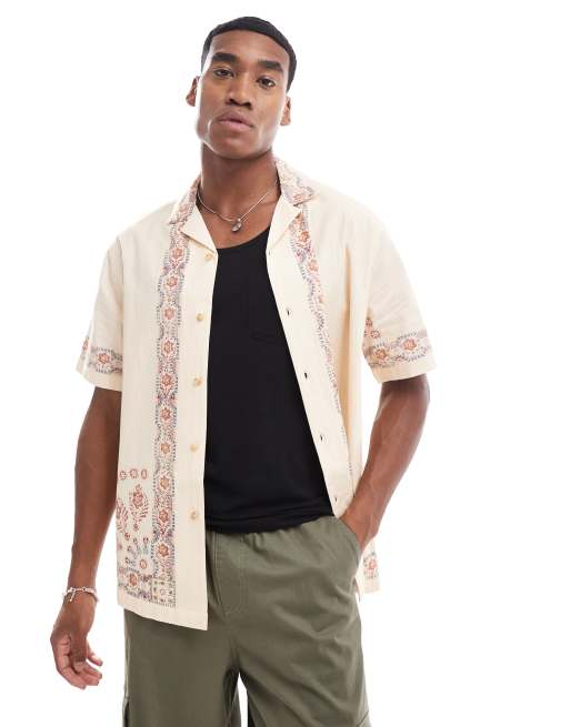 ASOS DESIGN – Koszula o luźnym kroju z kołnierzykiem kubańskim ozdobnym wzorem i nadrukiem na plecach