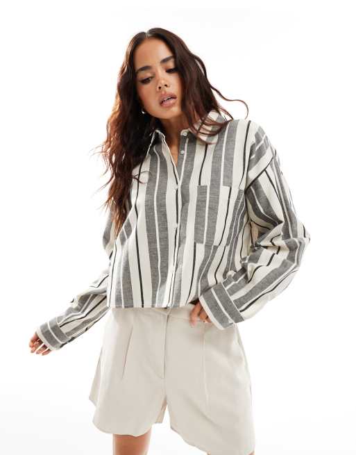 ASOS DESIGN – Koszula w paski o krótkim fasonie z domieszką lnu