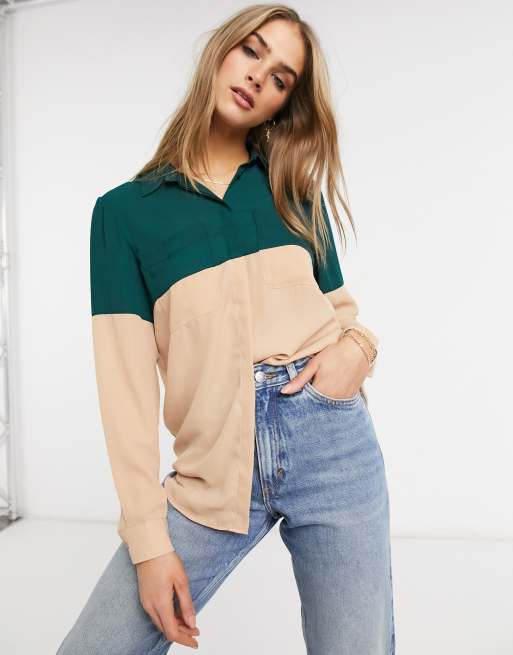 ASOS DESIGN – Koszula z blokami kolorów w kolorze morskim i kamiennobeżowym
