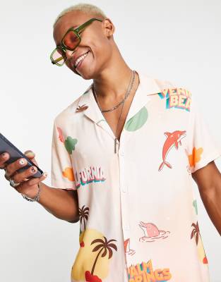 ASOS DESIGN – Koszula z kołnierzykiem kubańskim o luźnym kroju z nadrukiem plaży w Wenecji