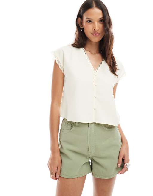 ASOS DESIGN – Kremowa bluzka z krótkimi rękawami i koronkowym obszyciem