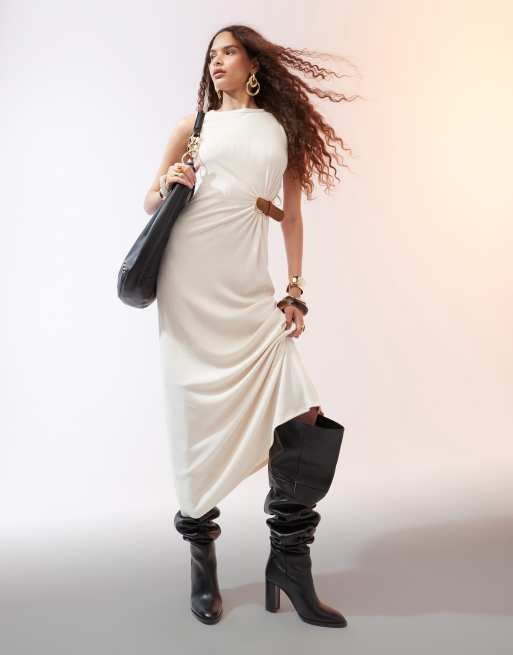 ASOS DESIGN – Kremowa prążkowana sukienka midaxi z ozdobnym paskiem