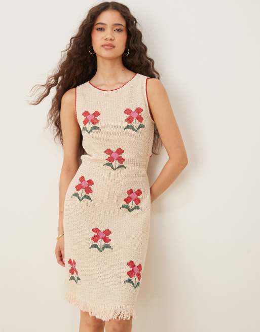 ASOS DESIGN – Kremowa, szydełkowa sukienka patchworkowa mini w haftowany, kwiatowy wzór
