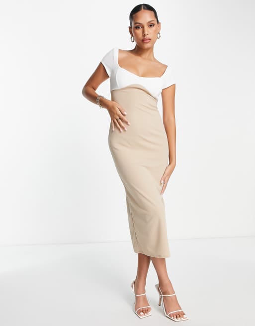 ASOS DESIGN – Kremowo-camelowa sukienka midi z bardzo krótkimi rękawami i blokami kolorów
