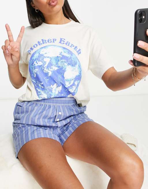 ASOS DESIGN – Kremowo-niebieska piżama z T-shirtem oversize i szortami w paski