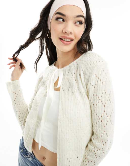 ASOS DESIGN Kremowy dopasowany kardigan o ażurowym splocie z kokardką