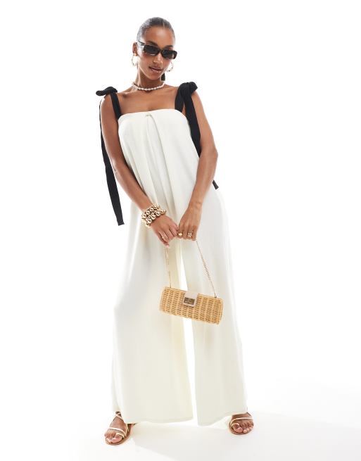 ASOS DESIGN – Kremowy kombinezon z szerokimi nogawkami na wiązanych ramiączkach ze wstążki