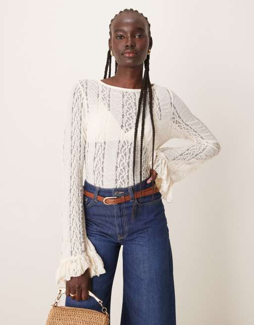 ASOS DESIGN – Kremowy koronkowy top z długim rękawem