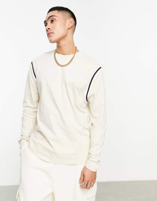 ASOS DESIGN – Kremowy luźny T-shirt z długimi rękawami z ozdobną taśmą