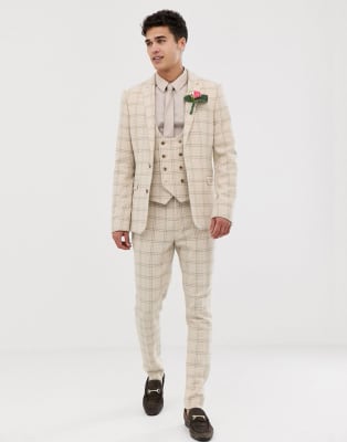 ASOS DESIGN - Kremowy mocno dopasowany garnitur ślubny w pepitkę z domieszką wełny