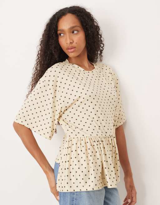 ASOS DESIGN – Kremowy pudełkowy T-shirt z asymetryczną baskinką we wzór w groszki