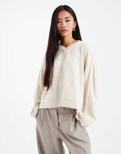 ASOS DESIGN – Kremowy sweter z zabudowanym dekoltem w szpic i rękawami o kroju bananowym