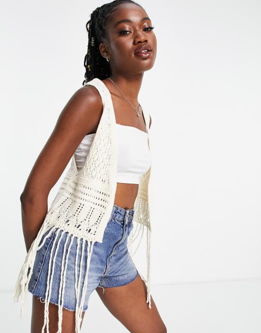 ASOS DESIGN – Kremowy szydełkowany kardigan festiwalowy bez rękawów, z frędzlami