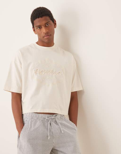 ASOS DESIGN – Kremowy T-shirt o krótkim fasonie oversize z haftem w tym samym kolorze