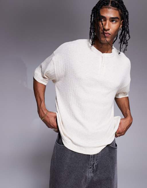 ASOS DESIGN – Kremowy T-shirt oversize o pudełkowym kroju i lnianym wyglądzie z dekoltem henley