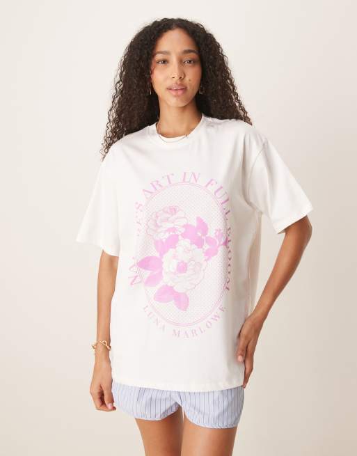 ASOS DESIGN – Kremowy T-shirt oversize z liliową grafiką z kwiatami