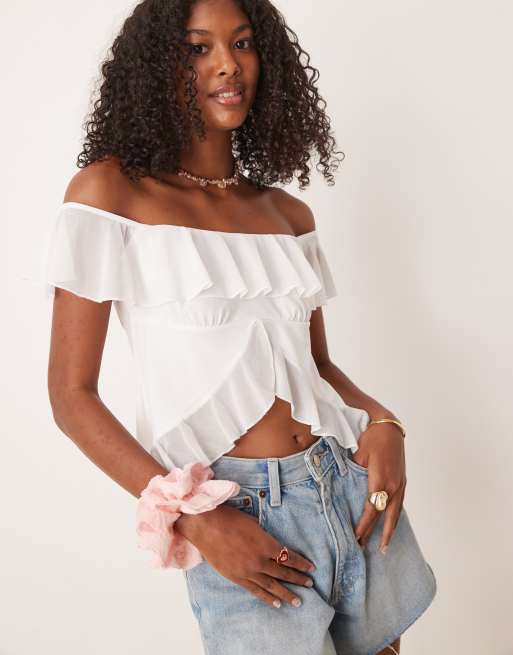 ASOS DESIGN – Kremowy top z dekoltem bardot, falbankami i rozcięciem z przodu