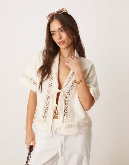 ASOS DESIGN – Kremowy wiązany z przodu top z kołnierzem i koronką