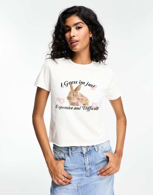 ASOS DESIGN – Krótki biały T-shirt z grafiką z królikiem z napisem