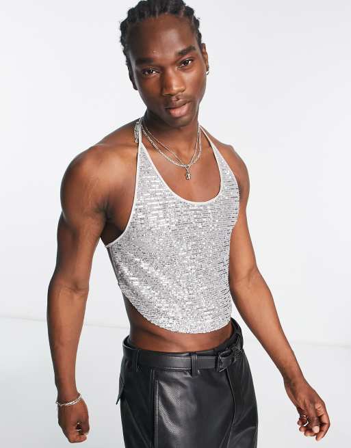 ASOS DESIGN – Krótki obcisły podkoszulek zdobiony cekinami w ozdobnymi paseczkami na plecach