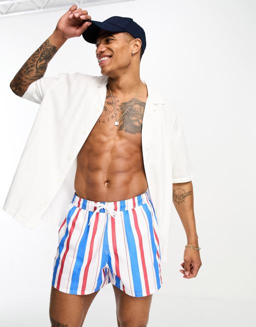 ASOS DESIGN – Krótkie szorty kąpielowe w niebiesko-czerwone paski