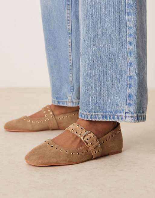 ASOS DESIGN – Larson – Szarobeżowe balerinki typu Mary Jane z imitacji zamszu z oczkami
