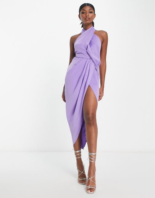 ASOS DESIGN – Liliowa drapowana sukienka midi z kopertowym dekoltem i sznurowaniem na plecach