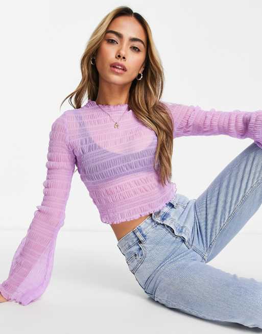 ASOS DESIGN – Liliowy siateczkowy krótki top z długimi rękawami i marszczeniem