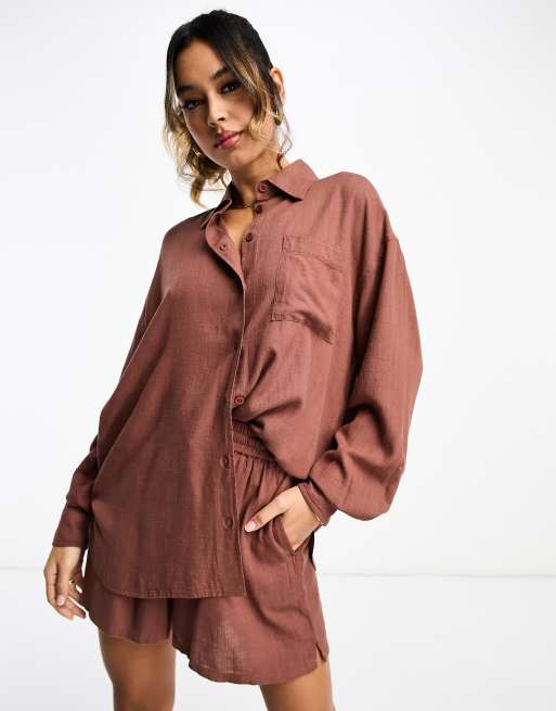 ASOS DESIGN – Lniana koszula o luźnym kroju z obniżonym dołem w kolorze terakoty