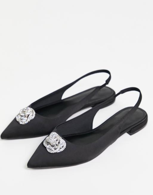 ASOS DESIGN – Lotus – Czarne satynowe balerinki na płaskiej podeszwie ze zdobionym paskiem za piętą