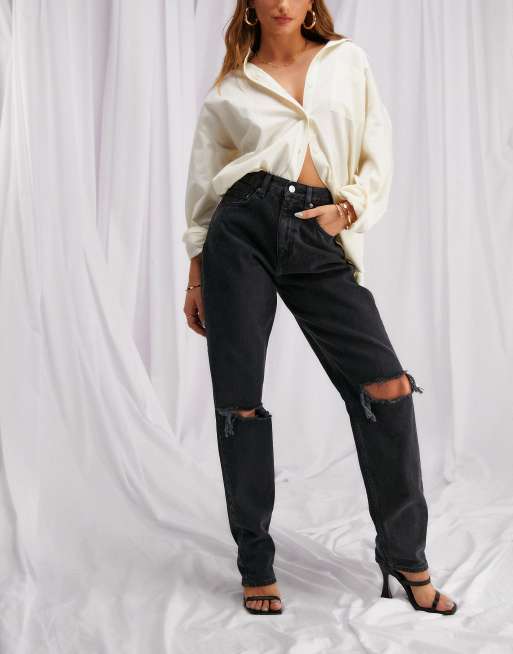 ASOS DESIGN – Luźne jeansy typu mom z podwyższonym stanem i przetarciami w spranym czarnym kolorze