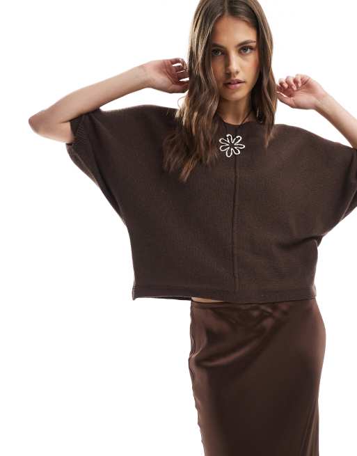 ASOS DESIGN – Luźny brązowy T-shirt dzianinowy z ozdobnymi przeszyciami
