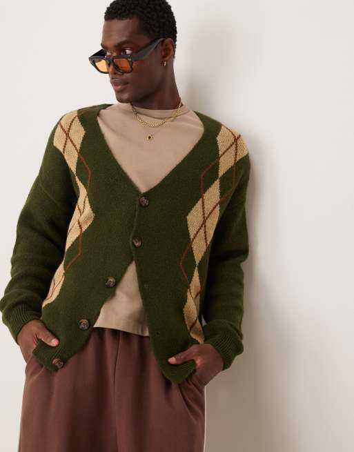 ASOS DESIGN – Luźny kardigan z puszystej dzianiny w kolorze khaki w romby