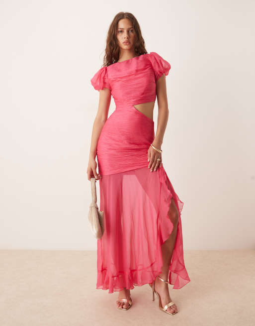 ASOS DESIGN – Malinowa sukienka maxi z marszczoną górą, wycięciem i obniżonym stanem