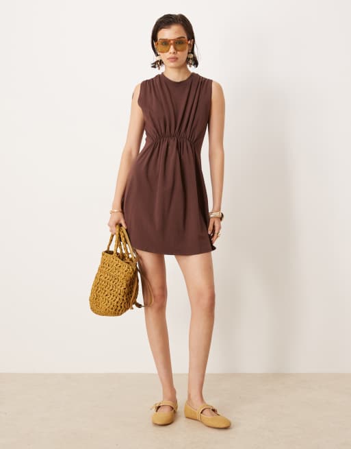 ASOS DESIGN – Marszczona czekoladowa sukienka mini bez rękawów z zabudowanym dekoltem